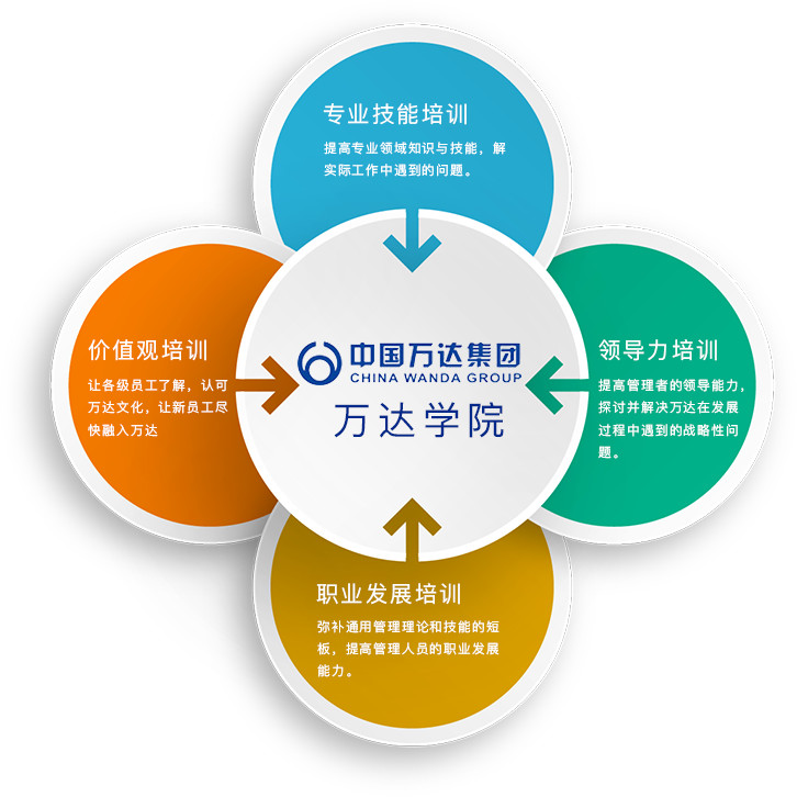 2013年7月,萬達學院正式成立,標志著萬達集團員工培訓發(fā)展工作進入新的里程碑。萬達學院由5個職能部室與5個培訓單元構(gòu)成。職能部室包括行政管理處、測評管理處、外聯(lián)管理處、職前培訓管理處和提升培訓管理處,配套設(shè)立了圖書閱覽室和檔案室。培訓單元包括素質(zhì)拓展中心、益智中心、教學中心、電子信息中心、競技中心等。